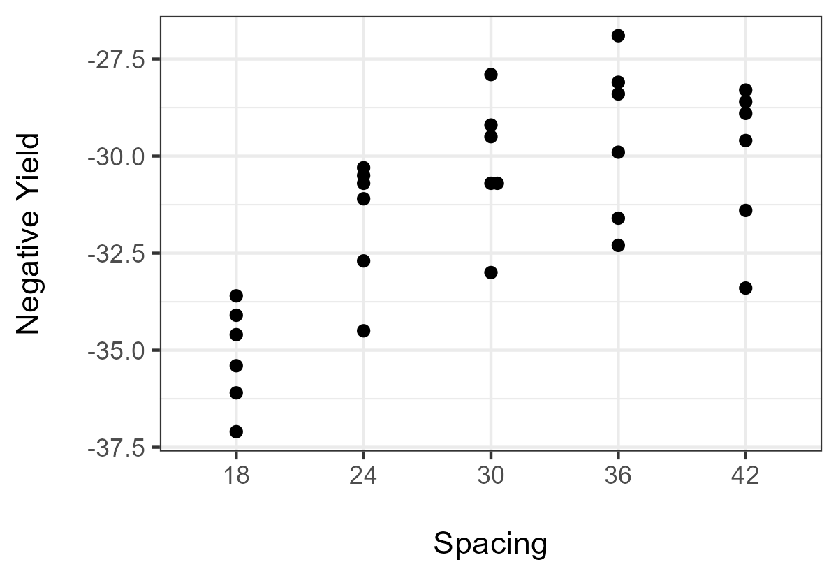 Plot02 = ggplot(Data, aes(y = YieldNegative,x = Spacing)) +